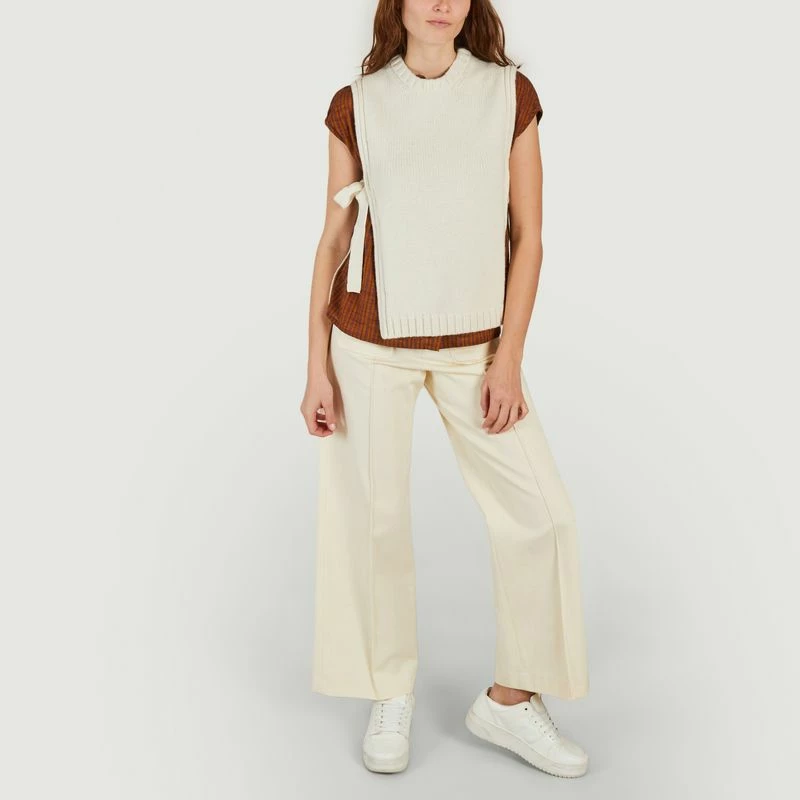 Pantalon en toile de coton écru, coupe droite légèrement évasée, deux poches plaquées devant et dos, pli marqué le long de la jambe.